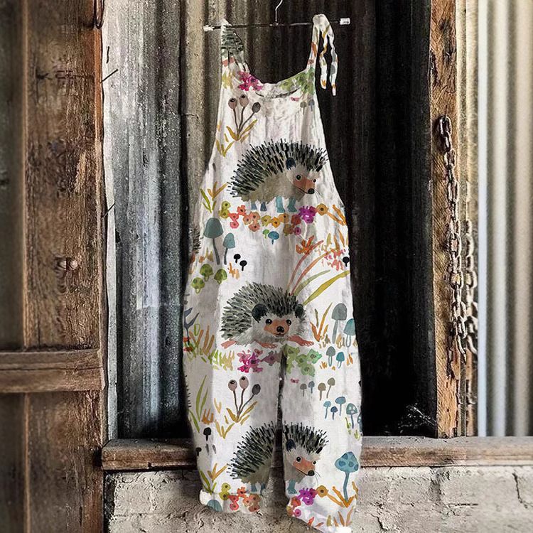 BD Women's Summer New Cotton Linen Overalls Printed Strap Casual Jumpsuit Beach Pants