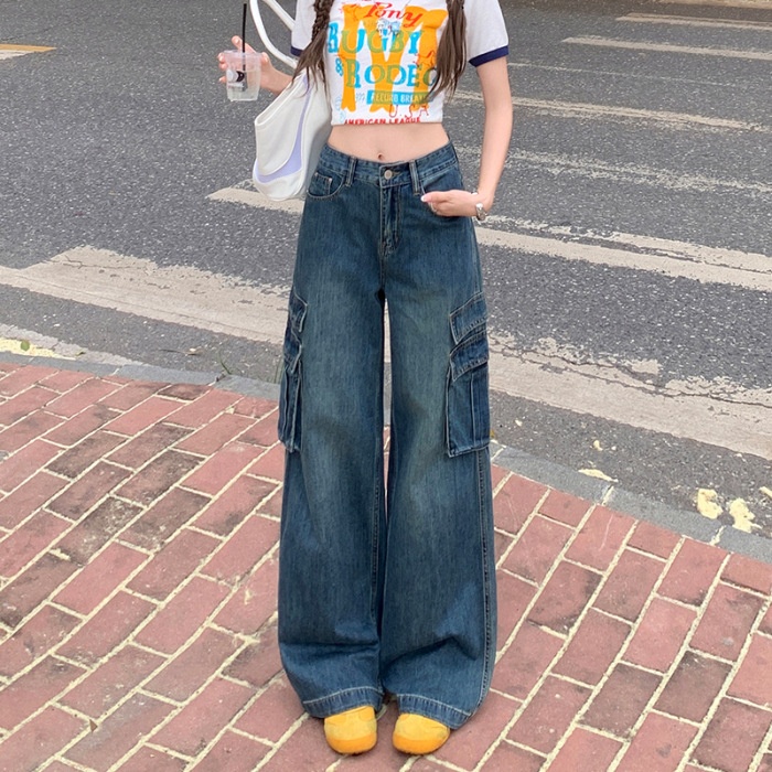 ChicShe Vintage Blue Washed Cargo Jeans For Women New American Retro High Waist Straight Wide Leg Pants