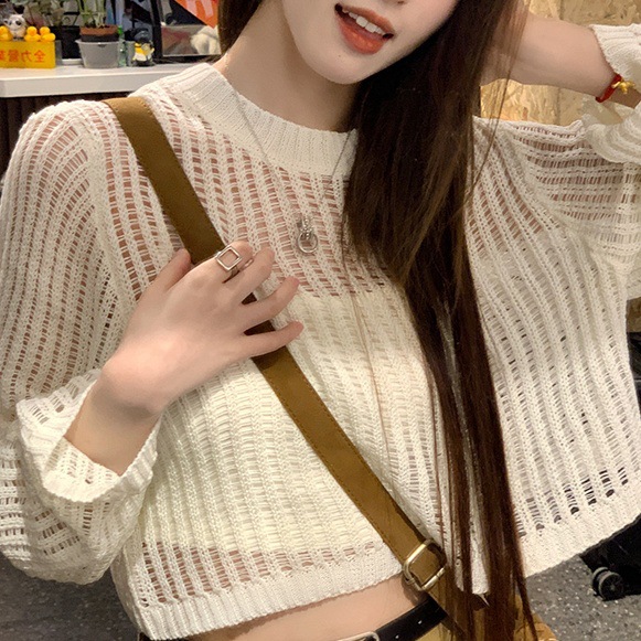Design sense: Thin hollowed out mesh long sleeved sunscreen knitted sweater for women, loose and versatile for spring and summer, short outerwear cover