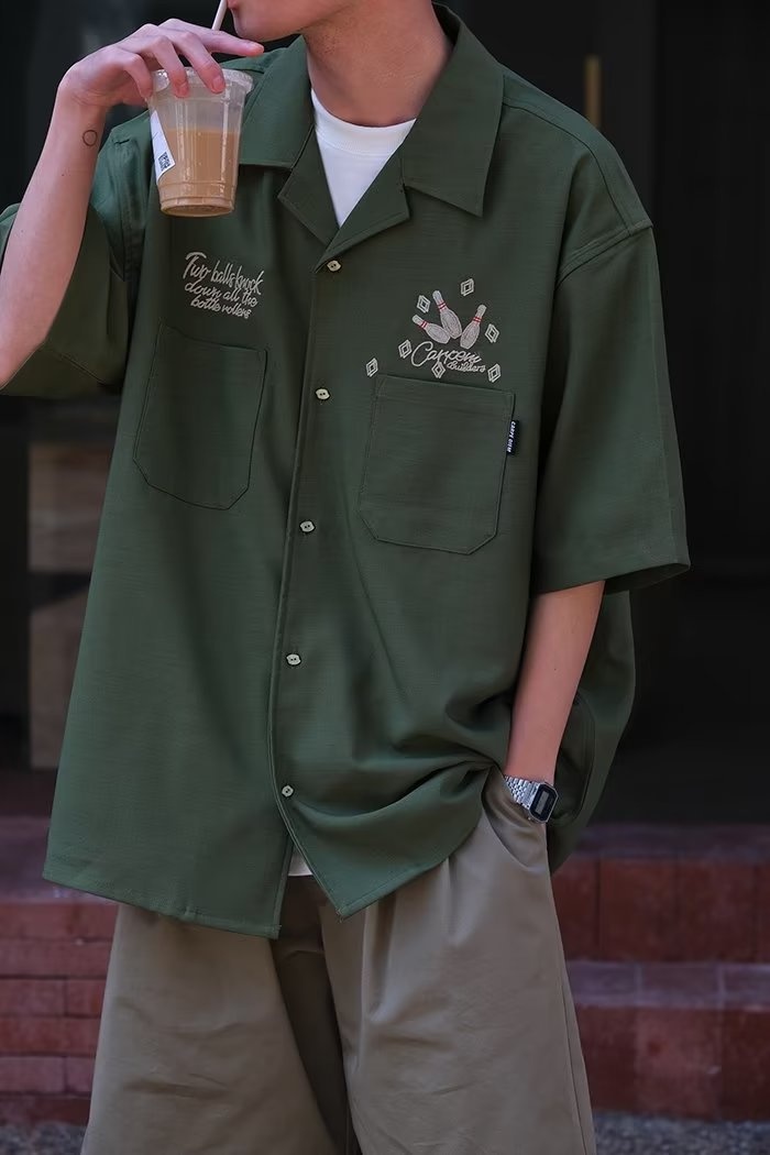 ForMen 2023 Summer American Style Loose Cuban Collar Bowling Embroidery Workwear Short Men Half Sleeve Shirt