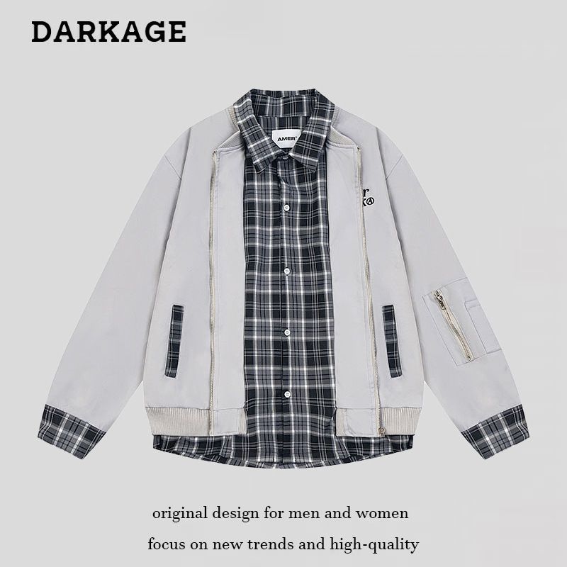 National Trend Brand Heavy Craft Design Layered Fake Two-Piece Color-Block Plaid Zipper Jacket Oversize Cardigan Jacket