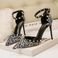 Sexy dámské klubové sandály na úzkém podpatku. Vysoké podpatky s mělkou špičatou hlavou, vydlabanými nýty a jednořádkovým páskem.