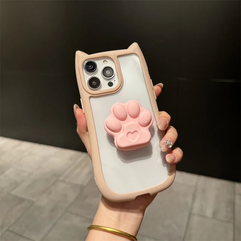 Liquid Transparent Full Coverage Silicone Cat Holder Soft Glitter Phone Case For iPhone 11 12 13 14 15 16 Pro Max Plus Cover